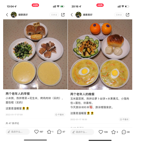 例如,在社区中的一对老年用户“健康真好”,他们时常在小红书中分享自己的一日三餐。在评论里许多年轻的网友会叫他们“爷爷奶奶”,并与他们一起分享自己的日常:冬至好不容易吃到的饺子、斥巨资换了的新手机、期末考试结束就可以回家了的心愿……