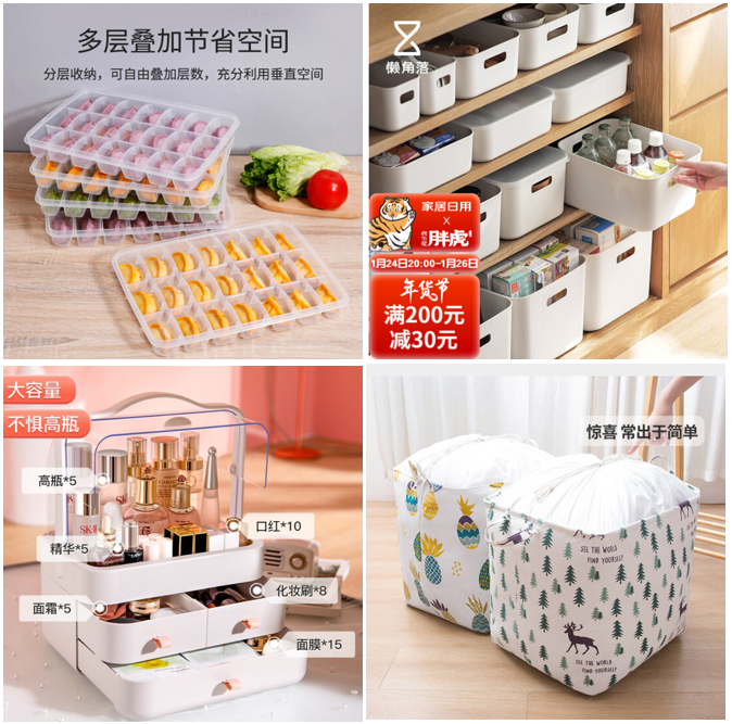 新年新气象,要把家里收拾得干净整洁,各种收纳神器必不可少。京东居家年货节期间,被子收纳、收纳柜等大件收纳同比增长超过100%。过大年吃饺子,一家人团团圆圆,饺子盒收纳同比增长350%。新年迎宾,招待亲朋用精美收纳更有面儿,水果收纳同比增长330%,桌面收纳同比均增长200%。出门拜年少不了精美妆容,化妆品收纳同比增长120%。春节走亲访友,气温骤降也不用怕,京东暖手宝、暖贴同比增长100%。赶着春节乔迁新居的朋友们也自有除醛妙招,京东除醛果冻同比增长300%。