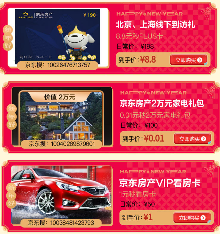 家是最温暖的港湾,想要幸福的生活,一个温馨的居所怎么能少?但是购房可不是一件简单的事,平日生活里不知多少人都为此操碎了心。今年春节期间,京东生活服务集结京东房产的优质房源及服务,推出了自营购房的金牌服务,为大家打造了贴心的“年货大礼包”,上线了北京朝阳明月听蘭、上海崇明十里江湾等热门城市的优质房产。看房、购房的同时还有各种新春福利让你拿到手软,包括0.01元秒京东房产2万元家电礼包、1元抢购京东房产VIP看房卡,8.8元秒杀京东PLUS卡等。