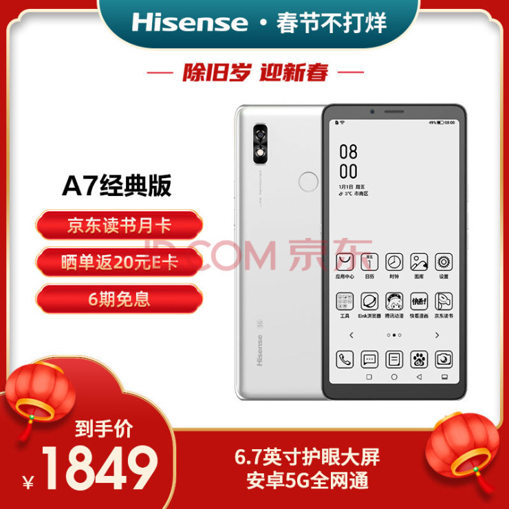 “春节不打烊”活动期间,新春特惠至高省700元,购机还可以享6期白条免息。除此之外,还能享受好评返现、官方保护壳、转盘抽奖等惊喜好礼。那么问题来了,这么多的阅读产品究竟该怎么选?今天小编就为大家推荐一款非常适合阅读爱好者、漫画爱好者的礼物——海信阅读手机A7,无论是自己用还是送礼都倍有面儿!
