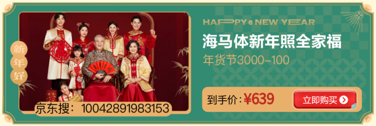 把家居和礼物都安排妥当之后,我们还要把这个年过得有纪念意义,而带全家拍一张全家福,绝对是最温馨的一件事。今年的年货节,为满足大家新年拍照需求,摄影写真也重磅出现在京东生活服务的金牌服务产品中,海马体新年全家福到手价639元,服饰中融入了富有美好寓意的祥云、锦鲤等元素,满满的中式韵味和喜庆氛围,这波福利不容错过!