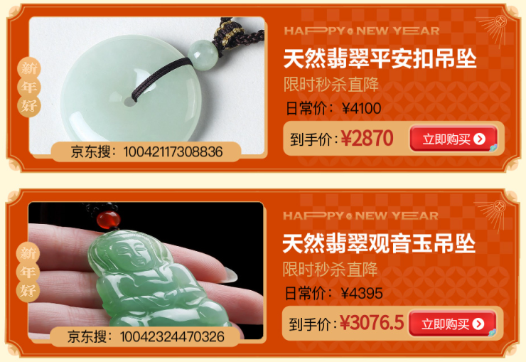 在中国传统文化中,佩戴玉石翡翠象征着平安吉祥,讨一份新年的好彩头。京东生活服务推出的首饰佳礼这一金牌服务,不得不说想得就是周到,带国检证书的翡翠手链、平安扣都给集美们安排上了,还有适合送给另一半的龙牌、送爸爸的观音、送妈妈的金枝玉叶等等,寓意和品质就是一整个拿捏住。喜欢翡翠却怕买到假货的小伙伴这下有福了,这波绝对可以放心冲。