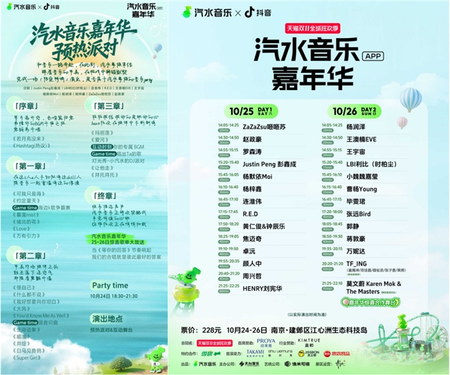10月25日,嘉年华狂欢正式开启~ZaZaZsu咂咂苏、赵政豪、罗森涛、Justin Peng 彭鑫成、杨默依Moi、杨梓鑫、连淮伟、R.E.D、黄仁俊&钟辰乐、焦迈奇、卓沅、颜人中、周兴哲、HENRY刘宪华以多元节奏点燃舞台,将嘉年华的欢乐氛围推向高潮。此外,当天还有惊喜特邀嘉宾——鸡排哥空降汽水音乐嘉年华·美食街区,14:00-19:00火热出摊!提前练习打开你的塑料袋哦~