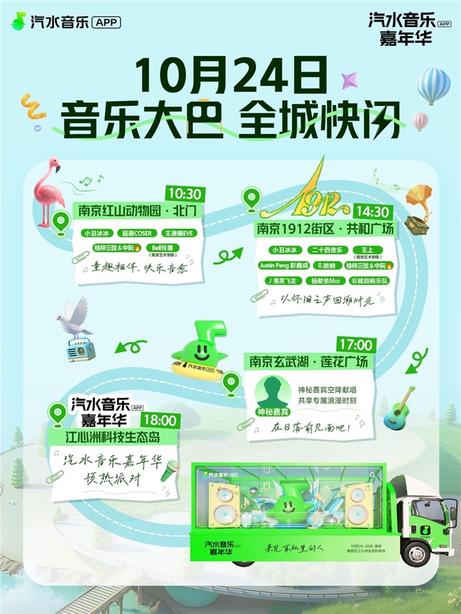 在嘉年华的舞台开始之前,一辆会唱歌的「音乐巴士」已悄悄启动,载着音乐穿梭南京三大地标——红山动物园·北门、1912街区·共和广场、玄武湖·莲花广场,通过3站的「巡游快闪」串联起整座城市的音乐节奏。最终,音乐巴士将带着我们一起驶入汽水音乐嘉年华的主场,一起迎接主舞台更多精彩~