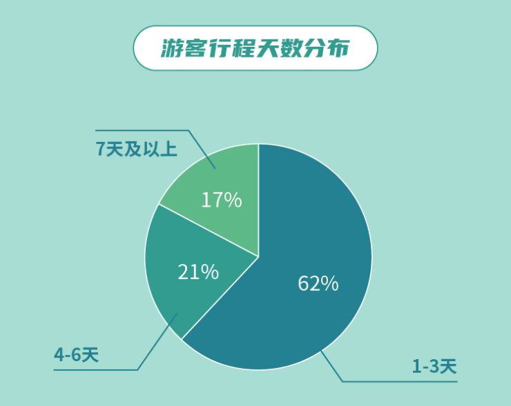 从出游订单人数分布来看,1-2人出游的订单占订单总量的63%,3-5人出游的订单占订单总量的18%,情侣、闺蜜、亲子家庭是其中的主流客群。从游客行程天数分布来看,行程在1-3天的游客占比超六成。一方面,单笔订单人数较少意味着清明假期出游客群十分注重旅途的私密性和安全性;另一方面,游客出游行程天数缩短也对旅游品质提出了更高的要求。