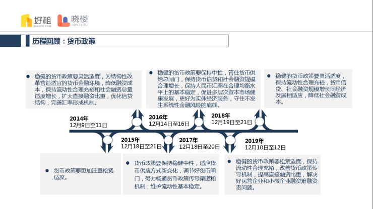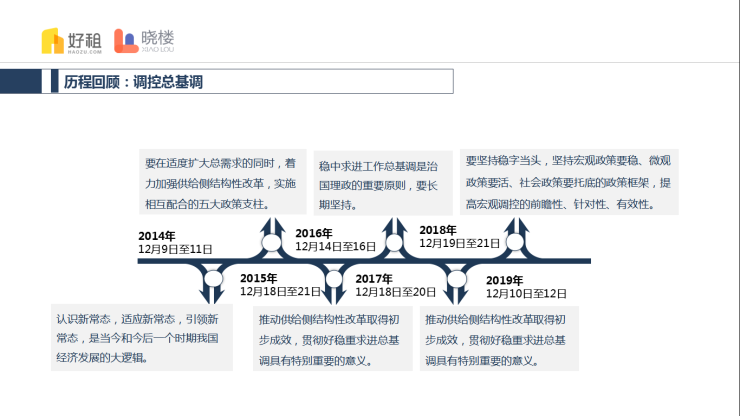 第二部分,晓楼回顾了2014年以来的历届会议,调控总基调从“稳中求进”到“稳字当头”,财政政策越来越强调注重结构调整,坚决压缩一般性支出,做好基本民生等重点领域保障,货币政策从松紧适度、稳健中性到保持流动性合理充裕,社会融资成本友好。