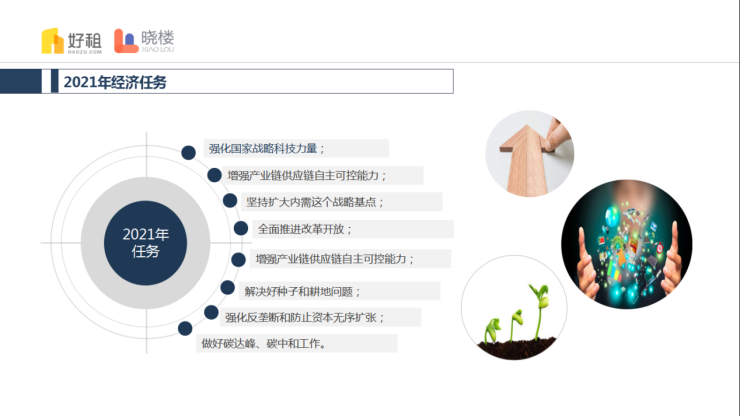 报告最后,晓楼整理了2021年八项经济任务,分别是:强化国家战略科技力量;增强产业链供应链自主可控能力;坚持扩大内需这个战略基点;全面推进改革开放;增强产业链供应链自主可控能力;解决好种子和耕地问题;强化反垄断和防止资本无序扩张;做好碳达峰、碳中和工作。