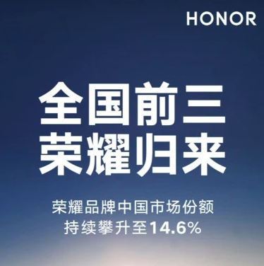 根据荣耀援引的第三方机构数据显示,荣耀国内的周市场份额达到了14.6%,排名已重回全国前三。