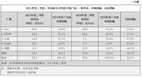 从各大手机厂商长期的市场占有率对比来看,荣耀目前还不占优势。新机市场上,2021年二季度市场数据显示,荣耀以6.9%的出货量重返前5,但同时vivo、OPPO分别以23.8%、21.1%的市占率,排在国内市场的第一、二位。排在第三名的小米更是增速惊人,同比增幅达到47%,国内市场份额也已接近20%。