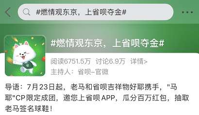 凭借着马布里在国内的知名度,和省呗超萌的IP吉祥物,“超萌反差”的马耶CP快速的俘获了“萌即正义”的年轻一代。截止目前,“燃情观东京,上省呗夺金”的微博活动话题阅读量达到了6752万,网友讨论量接近7万。