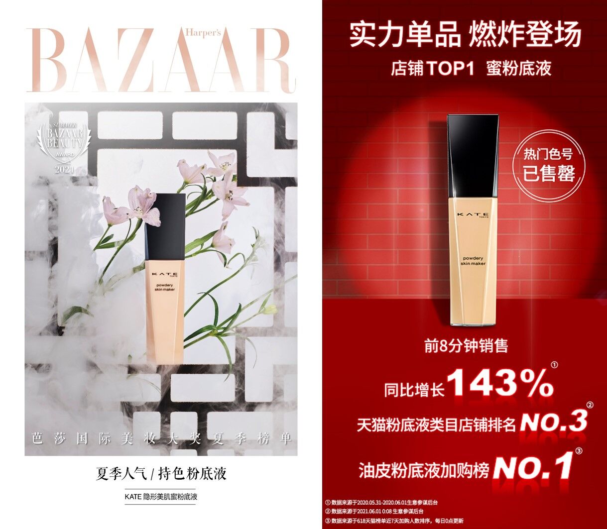 得奖时尚芭莎夏季人气粉底液;和潘雨润合作直播卖到断货;618实现天猫油皮粉底液加购榜NO.1,粉底液类目店铺排名NO.3。