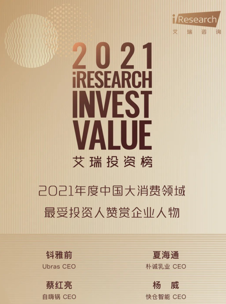 8月24日,艾瑞咨询正式发布了《2021艾瑞投资榜(大消费)榜单》。其中,艾瑞投资榜-2021年度中国大消费领域,旨在发掘与表彰新经济领域大消费赛道中具有独特战略视野的企业家,其中朴诚乳业创始人兼CEO夏海通成为榜单中唯一一位来自乳品行业的企业家。