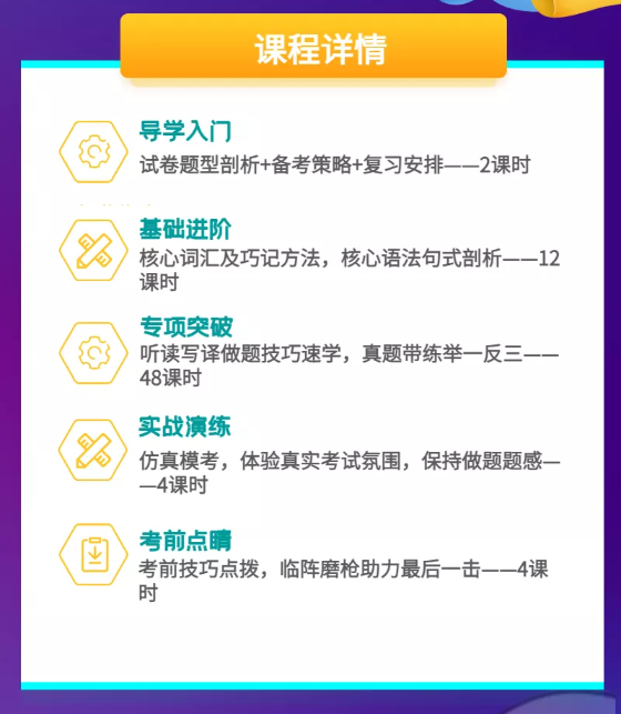 立足考生的学习和认知特点,文都教育将“大学英语四六级上岸速成班”的课程科学划分为导学、基础、专项、仿真、冲刺5大阶段,涵盖高分规划、语法、听力、翻译、阅读、写作、口语、全仿真模拟和冲刺点拨9大板块。课程教学由浅入深、环环相扣,结合“讲、练、测、评”教学闭环,实现考生英语综合能力的全面提升,为后续考研、留学、雅思、托福、口语提升等夯实基础。