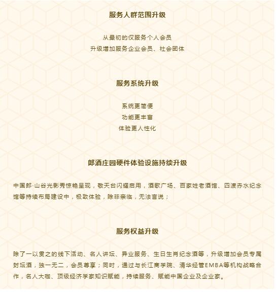 郎酒庄园会员中心,致力于为用户提供极致服务与体验,创造满意、感动和惊喜;依托于顶级专家学者输出洞见与智慧,赋能企业家持续成功;通过交流、互动、鉴赏,链接与创造价值,最终实现品牌与用户的共同生长、彼此卓越与美好。