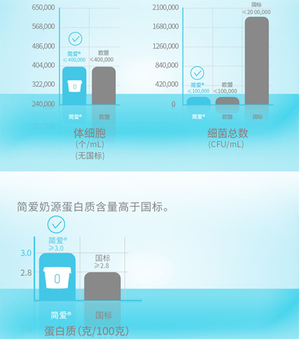 为了保证“每一滴奶都是安心好奶”,简爱酸奶制定了严苛的奶源标准,其中三大关键性指标:蛋白质、体细胞、菌落总数全部达到甚至超过欧盟标准,蛋白质含量≥3.2g/100mL,体细胞计数≤40万/mL,菌落总数降低至至高不超过10万CFU/mL。