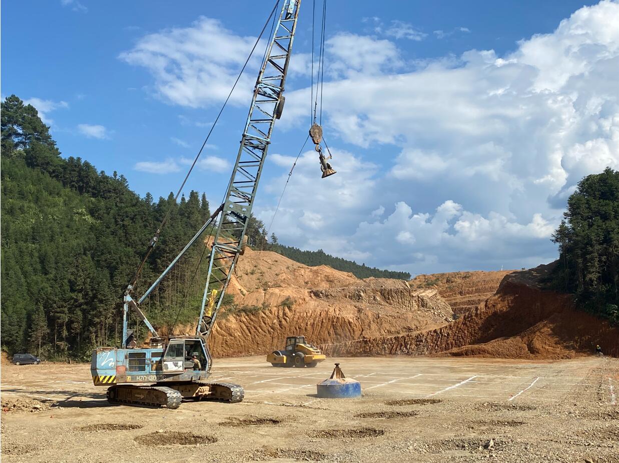 1#梁场位于路基填挖交界段,其中制梁区地处28m的高填方路基,此次浇筑的40mT梁单片自重108T,对地基承载力要求极高。为确保施工过程中制梁区路基“零沉降”,项目多次开展技术论证,投入两台“强夯机”对路基进行补强处理,在正常填筑压实的基础上每2m厚度再强夯一次,保证填筑质量的同时有效提升填筑速度。