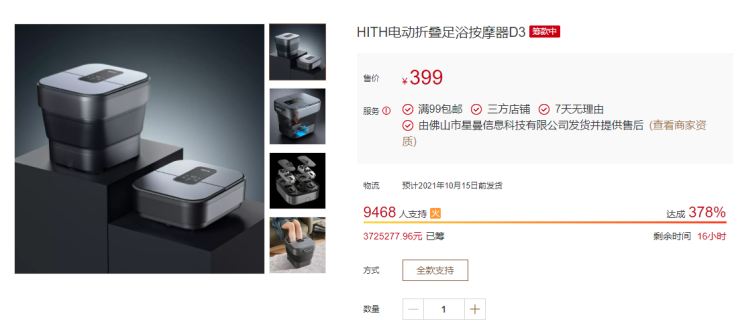 9月4日,家用健康管理品牌HITH星曼科技第一款智能折叠足浴器D3在小米有品众筹上线。截至目前,该款足浴器获得近9500人支持,众筹达成率378%。