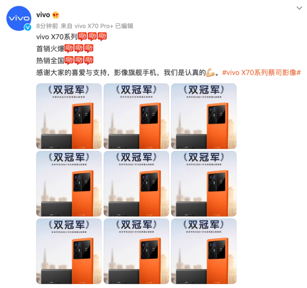 根据vivo官方微博今天发布的首销战报数据显示,vivo X70 系列火力十足,开售12小时,便迅速登上手机品类的销售排行榜冠军之位,在天猫、京东、苏宁易购等9大销售平台,取得了销量与销售额双冠军的开门红战绩,成为当之无愧的人气单品。