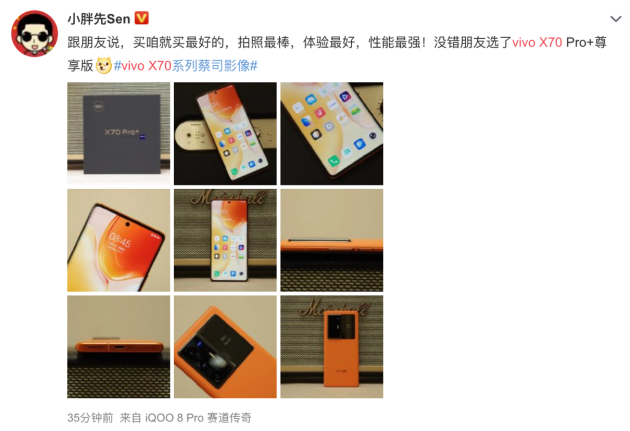 已经拿到新机的用户,第一时间晒出自己的开箱视频、分享产品美图,对X70系列赞叹不已。在各销售平台的评论中也不乏用户对vivo X70系列的赞美:“人像拍摄太赞了,和相机拍出来的质感一样,连虚化光斑都像是精心调教过的一样。”“被X70的夜视效果惊到了,甩苹果几条街啊!”“外观一如既往的好看,爱马仕橙高级”从X70 系列的影像实力到外观设计,字里行间透露出用户对X70系列的偏爱与满意。