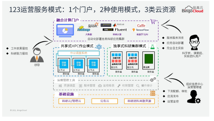 作为中国最早一批进行“HPC in Cloud”应用模式的实践者和异构融合技术路线的先驱者,品高云为科研用户打造契合自身需要的融合科研云平台。品高融合科研云方案采用 123 运营服务模式:1 个科研云门户,2 种使用模式(共享式 HPC 作业模式、独享式科研集群模式),3 类云资源(科研云/管理云、公有云、科研团队闲散资源),可提升科研机构的融合计算服务能力。