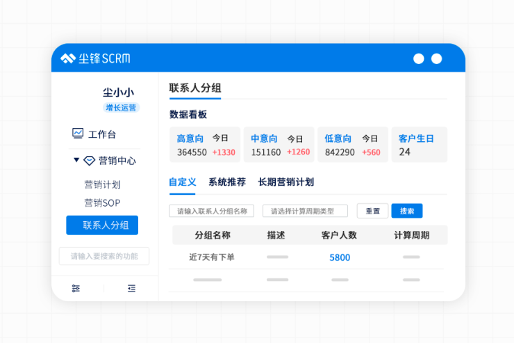 此外,联系人分组功能则利用数据分析能力,快速合并、筛选目标人群,将具有某些同一标签属性或特征的客户群体合并成组,统一开展运营动作,实现高效运营。企业可根据自身情况,灵活搭配各类标签,形成“标签集合”,后台即可自动筛选出符合条件的用户进行分组分层,并以“单次计算”和“每日例行”两种逻辑,带入多种运营场景中开展精细化运营。值得一提的是,该功能搭配智能标签功能,不仅最大限度完善了客户画像的立体标签体系,还让企业拥有了梳理标签组的能力,避免了标签零散、繁杂,阻碍运营的情况发生。同时,在尘锋SCRM本身的SOP能力的帮助下,企业可以快速通过标签筛选出高质量用户人群,并直接固化对应的运营动作自动运行,实现最大程度的降本增效。