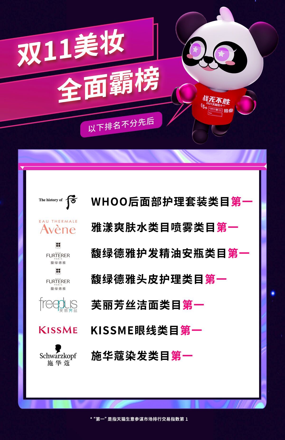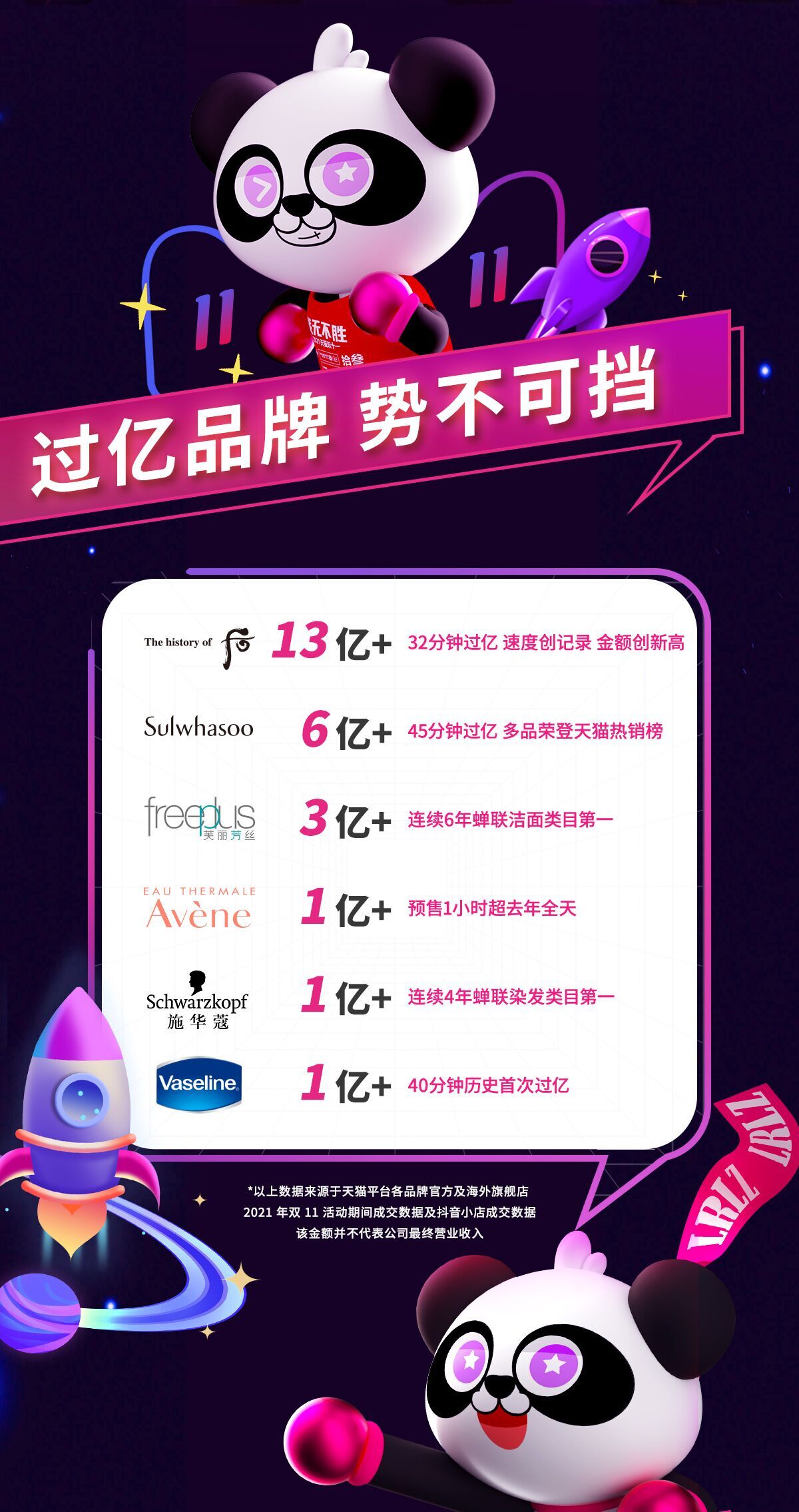 丽人丽妆在双11期间,合作的众多品牌强势增长,多个细分品牌登顶TOP1,销售战况良好。举例来看,后旗舰店超13亿,金额创新高;雪花秀旗舰店超6亿;芙丽芳丝超3亿;另外雅漾、施华蔻、凡士林等品牌成交均过亿。