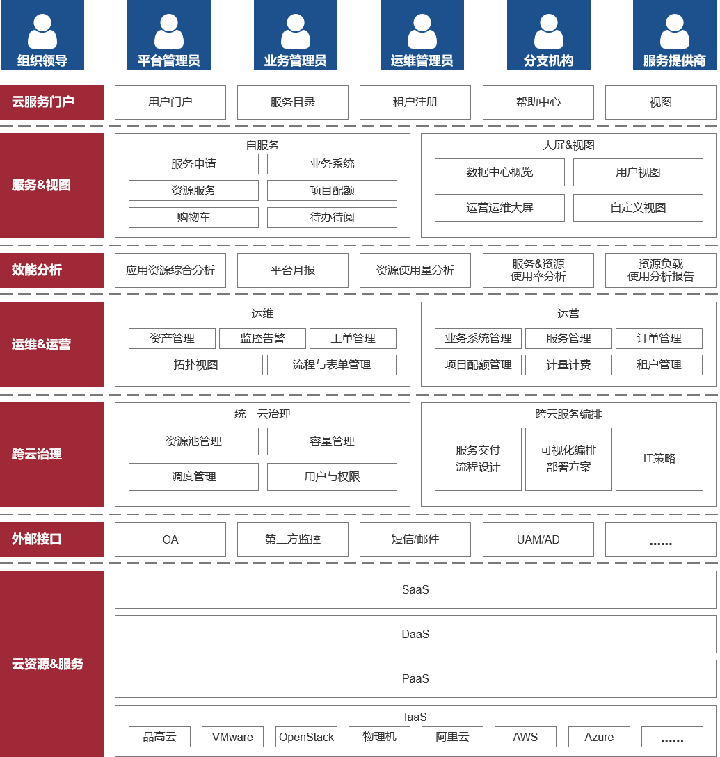 其融合企业云化的管理思路,为政府、企业客户,基于底层的计算、存储、网络能力,提供在线自助使用和管理各项云服务、对多数据中心资产(虚拟机、存储、网络、软件、物理服务器等)和服务(PaaS 服务、DaaS 服务等)的统一管理、多资源池的容量监控及预警、集中的监控告警、全生命周期的资源管理流程、图形化的统计分析报表及运维故障处理等的综合管理能力,从而实现对云数据中心统一、便捷、高效、智能的一体化运营运维管理。