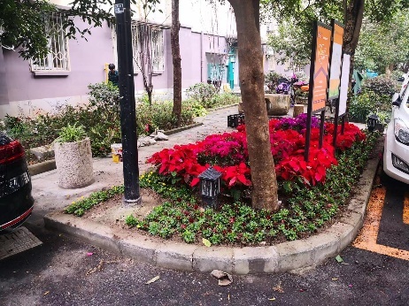 环境大整治以来,这些明艳的花卉有的植入在社区的绿色长廊中,有的嵌入在楼宇间的空隙地上,有的则融入在口袋公园的造景小品内,