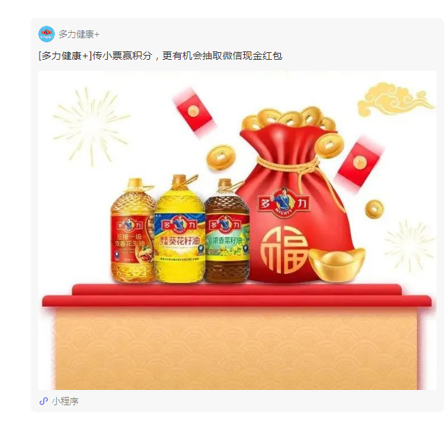 在线上渠道,多力在京东渠道上重点发力。一方面是京东物流配送次日达符合消费者对粮油类商品随用随买的消费习惯、消费场景;另一方面,京东商城的高品质商品口碑业余多力的品牌调性不谋而合。除此之外,多力在11月初还上线了“点亮中国味,赢多力新年福袋”的活动,用户在线下商超购买多力油品,通过小程序上传小票就能领取2022年新年福袋,以新颖的线上互动内容,吸引用户关注,真实打通线上互动和线下场景,实现线上线下一体化。