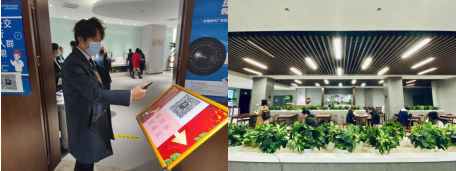 为避免人员聚集,确保园区餐厅安全有序供餐,当前园区餐厅实行错峰就餐、分时段用餐的模式,堂食座位数减少约60%,入场进行健康宝扫码、体温检测,就餐人员除用餐时需全程佩戴口罩,两人一桌,避免不必要交流。