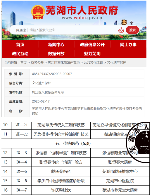 2020年,芜湖市人民政府公布:张恒春“恒制半夏技艺”入选非物质文化遗产代表性目录,张恒春传统“鸡药”验方入选非特质文化遗产代表性目录,张恒春为传统技艺和文化的保护传承又更进一步!张伟杰等编著出版了《张恒春中医药》,系统而全面地展现了张恒春中医药文化的全貌。