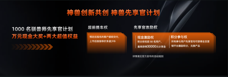 除却车型本身的亮点外,哈弗神兽借本次广州车展活动热度,同步启动了“神兽先享官计划”,共计1000个名额,且在预售期下订的驯兽师们,均可在预售期内抢先获得优先提车特权。