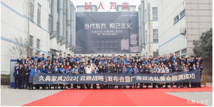 12月22-23日,久典家具2022云鼎战略发布会在山东临沂隆重举行。发布会以“当代东方 悦己主义”为主题,汇聚战略合作伙伴、优秀家居同仁、营销培训专家、新闻媒体等数百位嘉宾,共同见证大商风采、聆听成功经验、共沐知春温泉、同贺颁奖盛典!