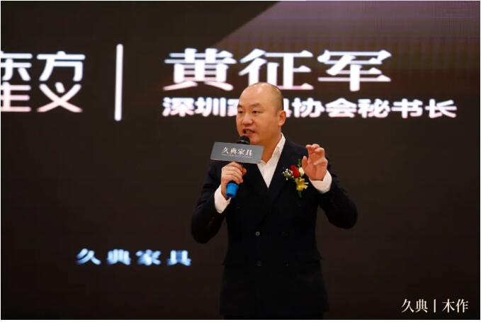作为深圳国际家居展战略合作伙伴单位,深家协副秘书长黄征军百忙之中来到发布会现场并发表重要讲话。黄秘表示,久典家具提速背后的关键,除了让消费者能更省事、更便捷、更高效实现智慧家打造,另一方面,久典人正在以超强的凝聚力和严格的品质把控加速行业升级。深家协为叶董点赞,为久典人自豪!