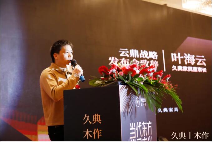 久典家具董事长、叶氏家族第四代制木传承人叶海云叶总率先上台致辞,代表久典家具全体同仁,对出席本次发布会的各位嘉宾、家居同仁以及经销商伙伴们表示诚挚的欢迎和感谢。