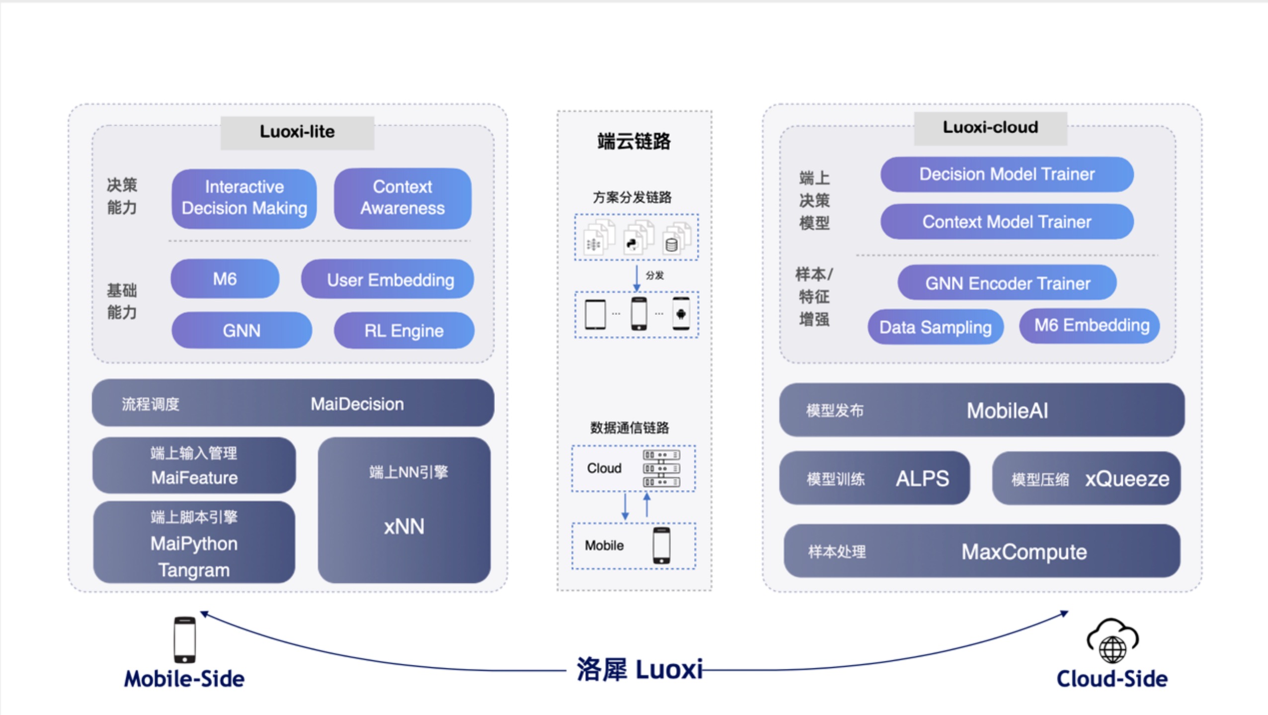 洛犀平台沉淀了端云两侧最佳实践的算法组件和平台服务。其中,平台在端侧以python/js package的形式提供服务,包含表征、文本理解、图计算等能力;在端云链路上,平台提供实现端云协同关键的通信能力,包括方案分发、数据通信链路;端云协同的模型训练累积沉淀在云端,包括端模型训练等。
