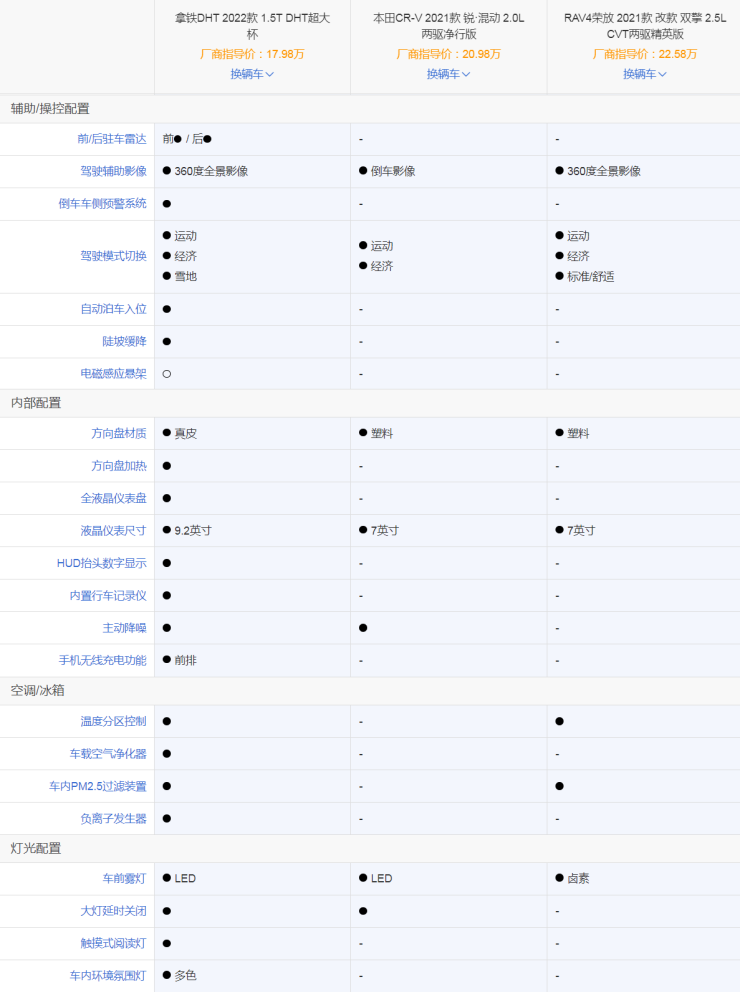 当然了,除了以上两点,很多小伙伴也很关心配置部分。如下图所示,不论是售价还是配置表现,拿铁DHT都更具竞争力。如此优秀的国产车型如何能让人不心动呢?如果喜欢这款车型,不妨去试驾亲身体验一番!