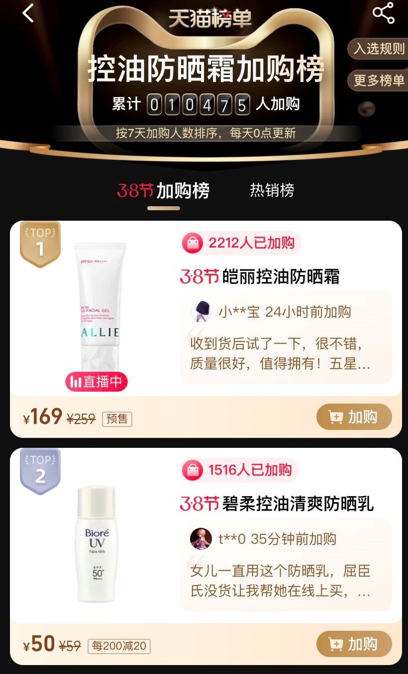2022年天猫3.8购物节丽人丽妆助力日系防晒品牌ALLIE皑丽预售阶段成交火爆。截止3月3日10:55,天猫官方旗舰店皑丽爆品防晒霜预售件数超9万,预售成交额达1200万+,并荣登天猫控油防晒霜加购榜TOP1。同时获得超级头部主播李佳琦推荐入选直播间,深受年轻消费者欢迎。