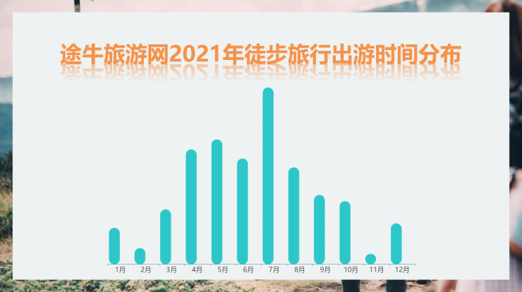 出游时间方面,途牛旅游网2021年出游数据显示,3月春季踏青是一年中徒步旅行热潮的开端,随着天气的回暖,徒步旅行也逐渐迎来出游热潮,并在7月达到出游顶峰。