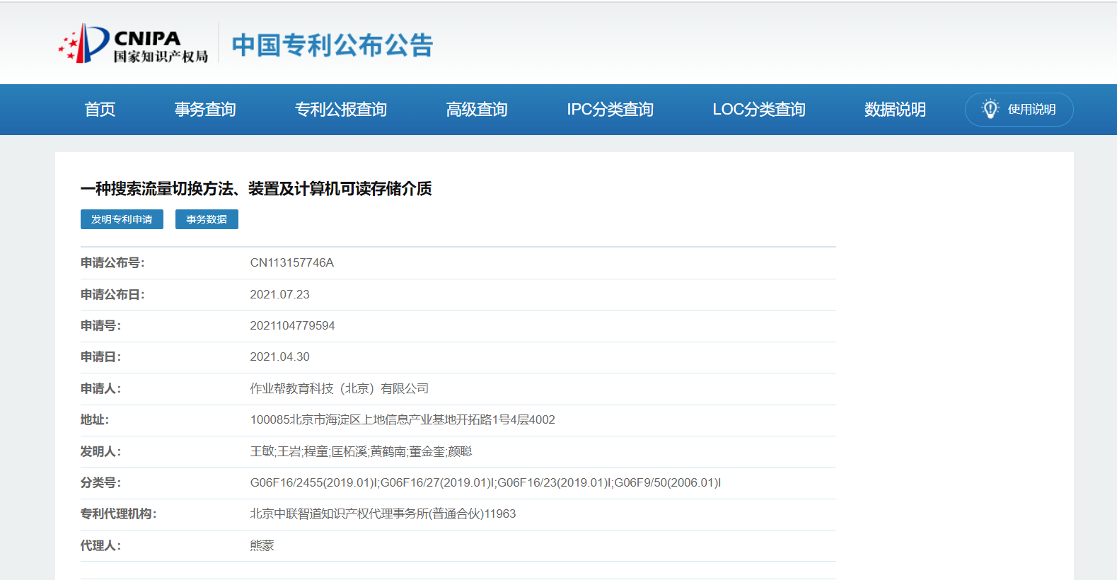 近日,记者从国家知识产权局官网获悉,作业帮公开了一项名为“一种搜索流量切换方法、装置及计算机可读存储介质”的发明专利。此项专利由作业帮教育科技(北京)有限公司于2021年4月提出申请并于2021年7月公开,申请公布号为CN113157746A。该发明提出了一种耗费资源少,流量切换简单方便的搜索流量切换方案。