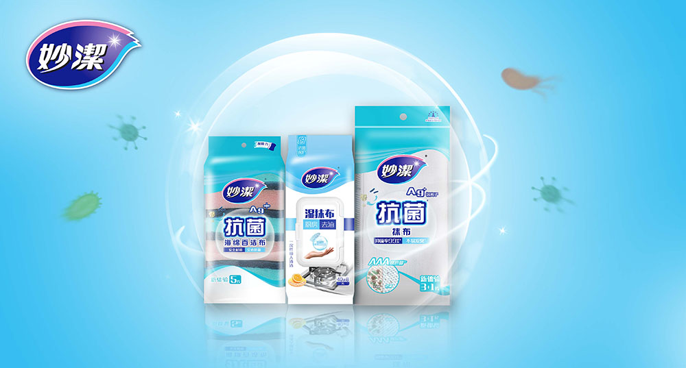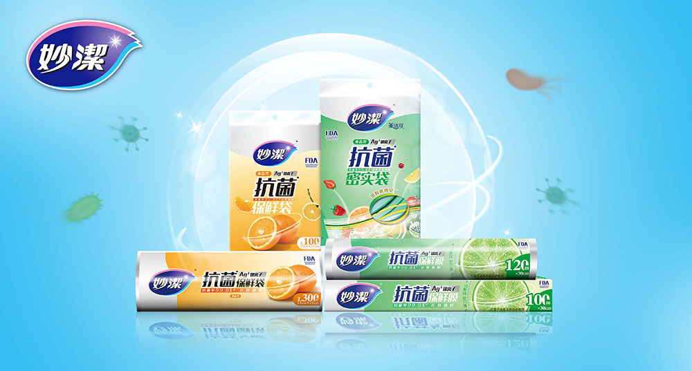 其厨房抗菌保鲜系列产品:妙洁抗菌保鲜膜和妙洁抗菌保鲜袋,添加了安全的银离子抗菌剂,抑菌率高达99.9%(针对金黄色葡萄球菌及大肠杆菌)*。能有效延缓、抑制细菌肆意繁殖滋生及由此导致的食物腐坏。与妙洁普通保鲜膜、保鲜袋相比,延长了保鲜时间。