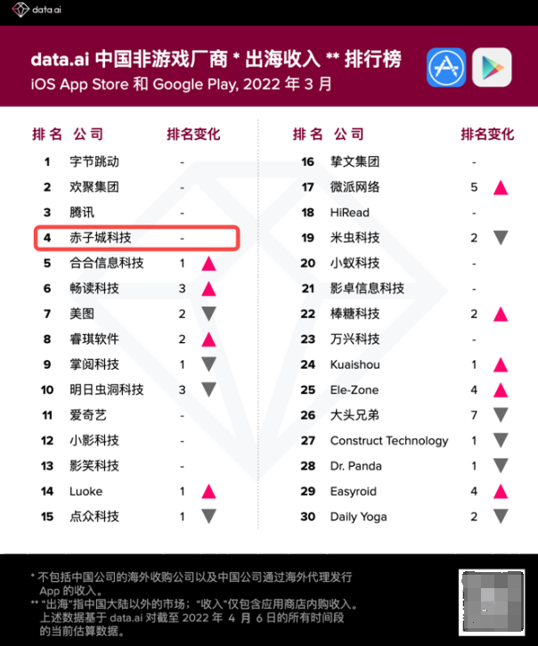 data.ai发布3月非游戏厂商出海收入榜,赤子城科技位列第4