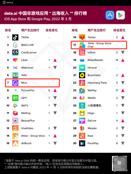 近日,聚合数据平台data.ai(原App Annie)发布3月中国非游戏厂商及应用出海收入30强榜单。赤子城科技凭借旗下社交产品矩阵的强势表现,位列厂商收入榜第4,保持领先优势。公司旗下两款社交产品MICO和YoHo进入应用收入榜,分别位列第7、第17。