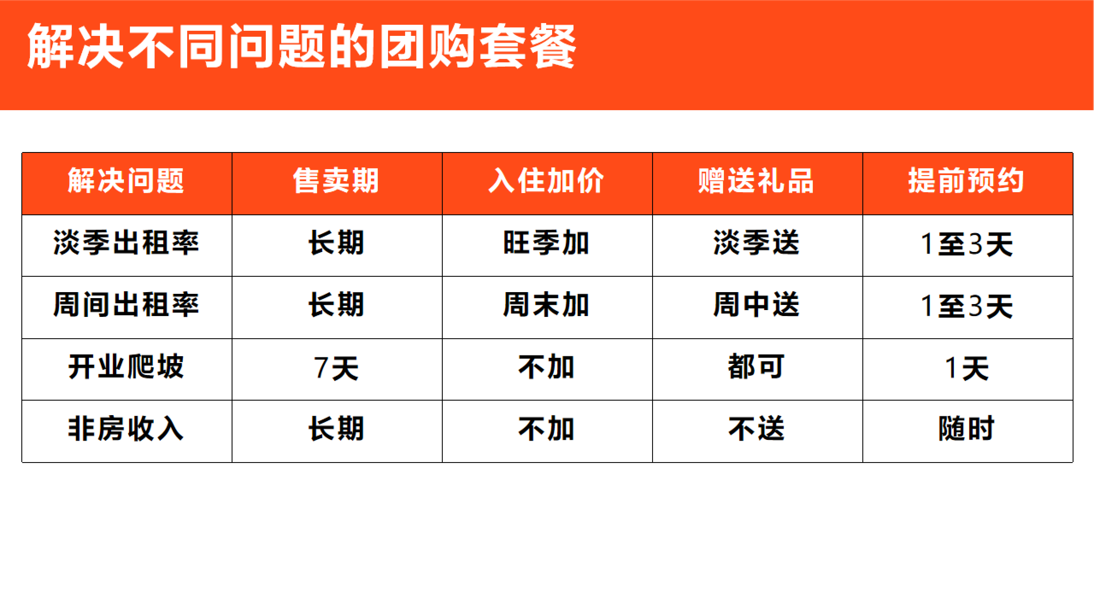 周间出租,指的是在周末出售的产品,这个问题通常出现在一些景区里酒店民宿,往往周末是客流高峰期。想要解决周间出租率的问题,你的产品可以全年入住,但是周末和节假日可以设置一个相对高的价格。同时,为了引导大家更多选择非周末的工作日入住,可以在套餐策划的时候设置一些赠品,比如下午茶、伴手礼等,将提前预约设置为1至3天。