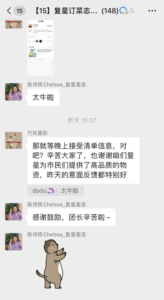 才到第2天,就有更多外部的志愿者纷纷申请加入复星甄选社区服务计划,微信群一个接一个满员了,复星甄选成立抗疫小分队,全员加入社区服务项目。