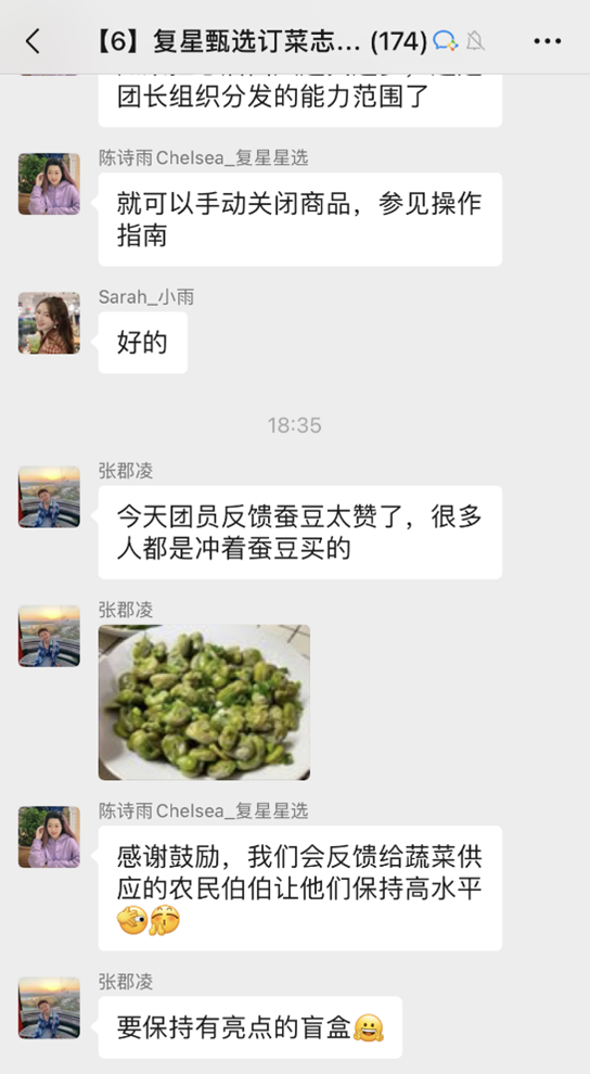 整个周末,罗丹萍同学没有休息,在知道有同学想要挺身而出为社区居民组织菜品团购缓解买菜难问题后,迅速完成了【复星甄选社区服务计划】整体方案设计,并拉通产业生态相关团队保障蔬菜供应链。