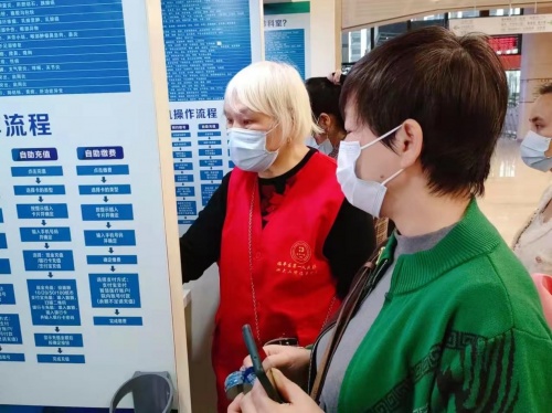 在杭州市临平区第一人民医院有这么一位奶奶级志愿者,她身穿红背心,一头极好辨认的银发,常年在门诊大楼里服务患者,一根手指在自助挂号机、报告单打印机上操作得飞快,引导患者挂号、取号、就诊都是熟门熟路,引得患者啧啧称奇。