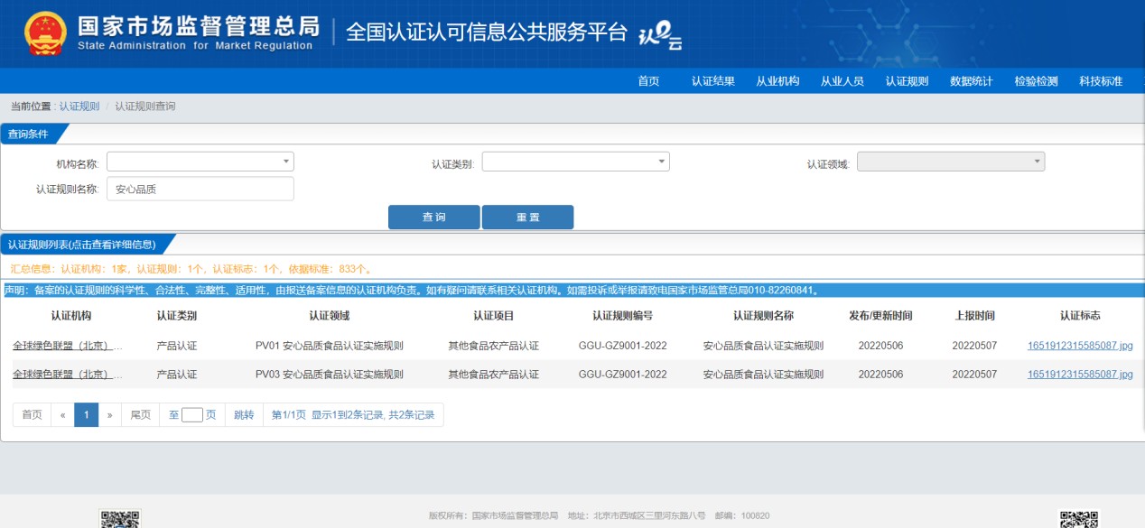 2022年5月9日,在国家市场监督管理总局全国认证认可信息公共服务平台认证规则名称栏输入“安心品质”4个字,点击查询后显示:全球绿色联盟(北京)食品安全认证中心是国内首家在国家市场监督管理总局完成了《安心品质食品认证实施规则》和《安心品质食品认证标志》备案发布的认证机构。