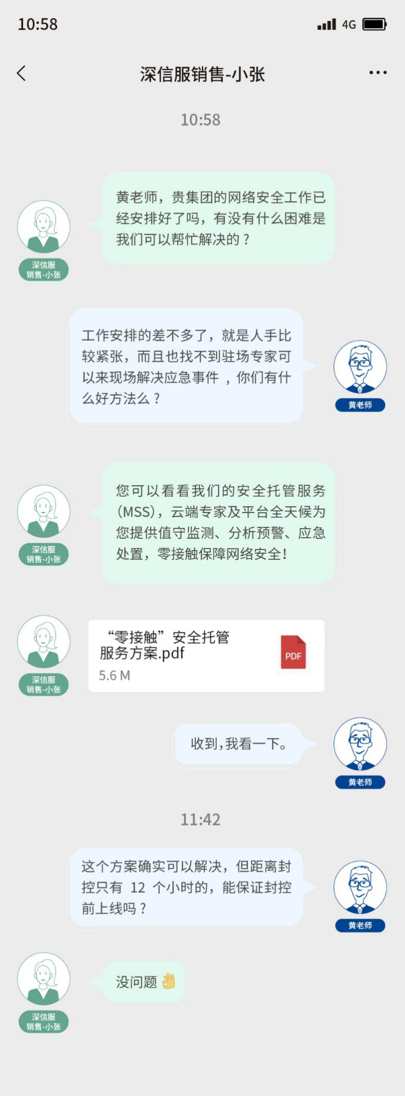 黄老师所在的集团正式完成“零接触”安全托管服务MSS上线,服务经理建立专属服务微信群开启正式服务。
