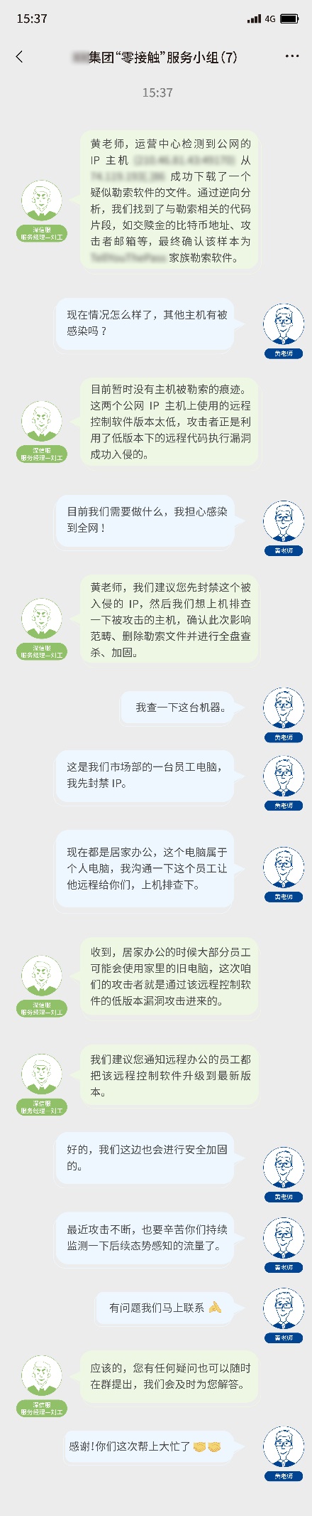 MSS实时响应的服务微信群缓解了我们看不见专家的焦虑心态,专业详细的处置建议、报告的输出帮助我们有条不紊地开展事件处置,给我们提供了“零接触”的保护、避险、响应。